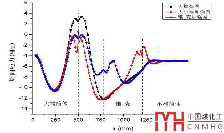 圖7 加強(qiáng)圈位于大小端及錐殼上時(shí)經(jīng)線方向的周向應(yīng)力分布