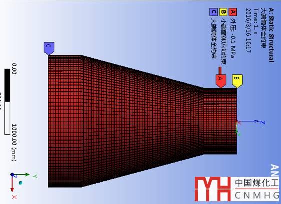 為更好的對(duì)外壓錐殼的穩(wěn)定性有直觀的認(rèn)識(shí),本章以一圓筒與錐殼連接結(jié)構(gòu)(圖3,半錐角α=15~60°)建立有限元模型。模型采用SHELL181殼單元,六面體網(wǎng)格劃分,施加相應(yīng)的載荷約束和位移約束邊界條件[5](圖4),對(duì)外壓作用下筒錐結(jié)構(gòu)的周向應(yīng)力分布規(guī)律及穩(wěn)定性進(jìn)行了分析。