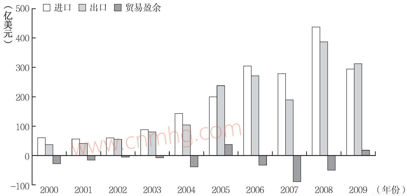 據(jù)中國(guó)國(guó)家統(tǒng)計(jì)局統(tǒng)計(jì)資料,2000~2009年,中國(guó)與海合會(huì)國(guó)家雙邊貿(mào)易額從100.9億美元上升到679.2億美元,年均增長(zhǎng)57.8%。中國(guó)對(duì)海合會(huì)國(guó)家的商品出口額從36.8億美元上升到312.5億美元,進(jìn)口額從64.5億美元上升到294.5億美元。其中,與中國(guó)貿(mào)易額較大的海合會(huì)國(guó)家有沙特、阿聯(lián)酋和阿曼,2009年貿(mào)易額分別達(dá)到325.5億美元、212.3億美元和61.6億美元。[1]