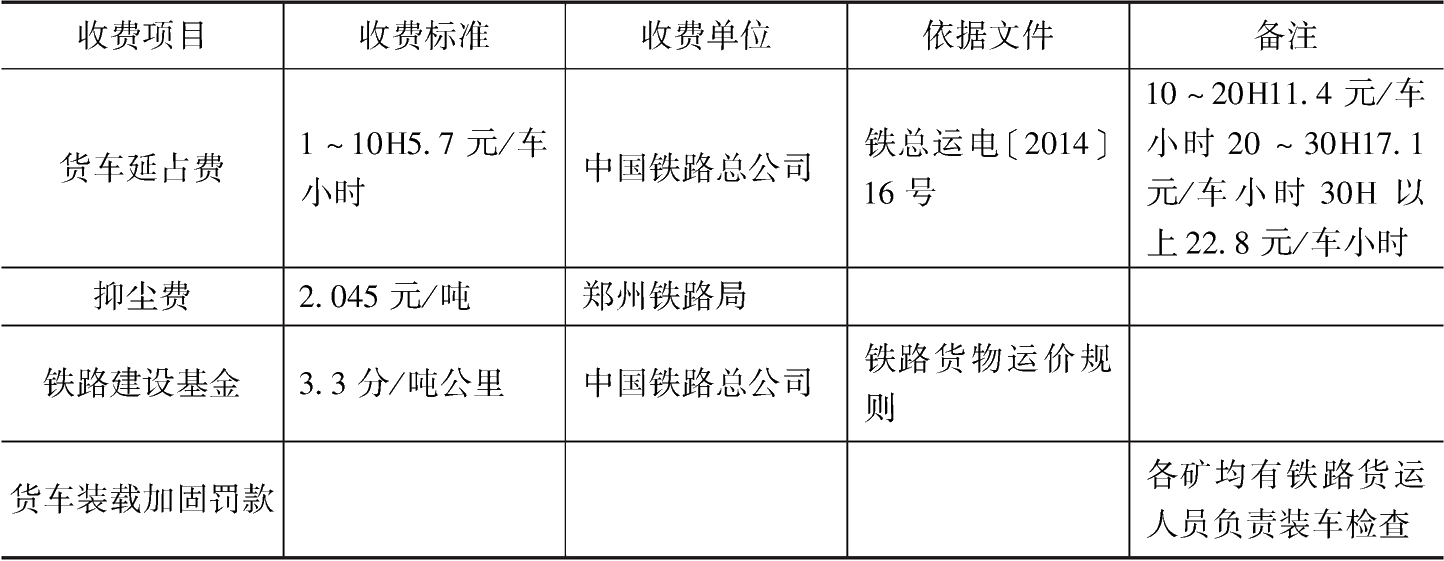 在煤炭產(chǎn)業(yè)中,煤炭企業(yè)物流環(huán)節(jié)成本構(gòu)成繁復(fù),各環(huán)節(jié)稅率不統(tǒng)一,不合理收費(fèi)多,稅費(fèi)重復(fù)征收,企業(yè)負(fù)擔(dān)沉重。以潞安集團(tuán)為例,2017年集團(tuán)商品煤運(yùn)輸費(fèi)為112.52元/噸,同比增加3.70元/噸。主要原因是鐵路運(yùn)費(fèi)大幅增加,上漲幅度達(dá)到10%,鐵路運(yùn)費(fèi)由原來“銷售方代墊運(yùn)費(fèi),購買方承擔(dān)”的方式變?yōu)楝F(xiàn)在“一口價(jià)”單獨(dú)核算、銷售方承擔(dān)模式。另外,生態(tài)文明進(jìn)程加快,環(huán)保約束越發(fā)趨嚴(yán),煤炭運(yùn)輸“公轉(zhuǎn)鐵”政策陸續(xù)落地,煤炭運(yùn)輸進(jìn)一步倚靠鐵路,運(yùn)輸成本進(jìn)一步向煤企全面集中轉(zhuǎn)嫁。目前煤炭企業(yè)物流成本中,除正常繳納的鐵路運(yùn)費(fèi)外,尚存在貨車延期占用費(fèi)、抑塵費(fèi)、貨車超偏載罰款、鐵路建設(shè)基金、運(yùn)費(fèi)預(yù)付等物流關(guān)聯(lián)費(fèi)用,進(jìn)一步增加了企業(yè)成本負(fù)擔(dān)(見表2)。
