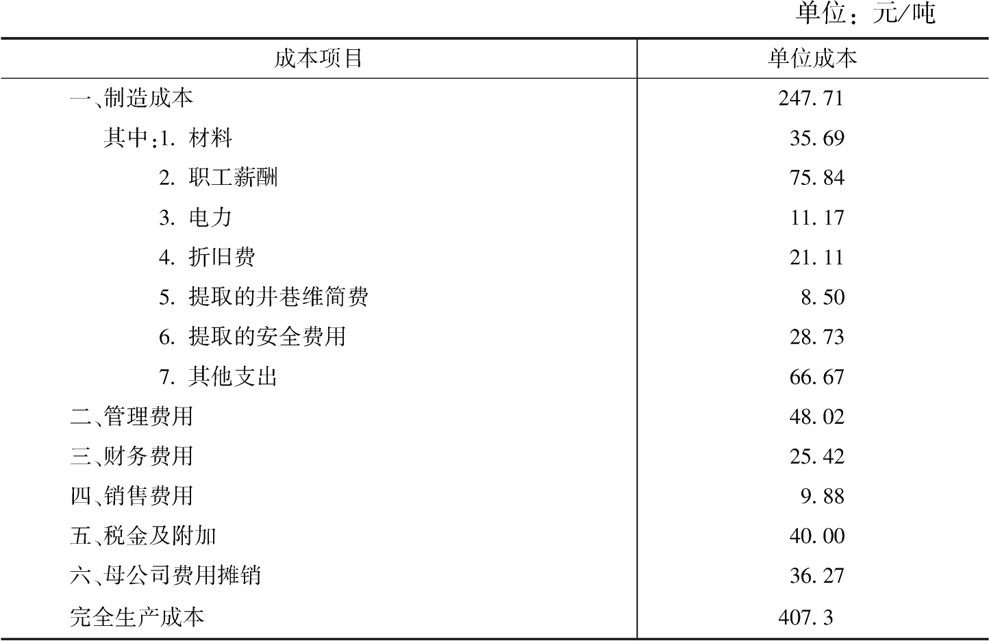 材料費(fèi)35.69元/噸,占比8.76%;職工薪酬75.84元/噸,占比18.62%;電力11.17元/噸,占比2.74%;折舊費(fèi)21.11元/噸,占比5.18%;提取的井巷、維簡費(fèi)8.5元/噸,占比2.09%;提取的安全費(fèi)用28.73元/噸,占比7.05%;管理費(fèi)用48.02元/噸,占比11.79%;財(cái)務(wù)費(fèi)用25.42元/噸,占比6.24%;銷售費(fèi)用9.88元/噸,占比2.43%;稅金及附加40元/噸,占比9.82%;母公司費(fèi)用攤銷(后勤、學(xué)校、醫(yī)院等企業(yè)辦社會(huì)費(fèi)用和集團(tuán)本部財(cái)務(wù)費(fèi)用)36.27元/噸,占比8.9%;其他支出66.67元/噸,占比16.37%。具體情況見表1。