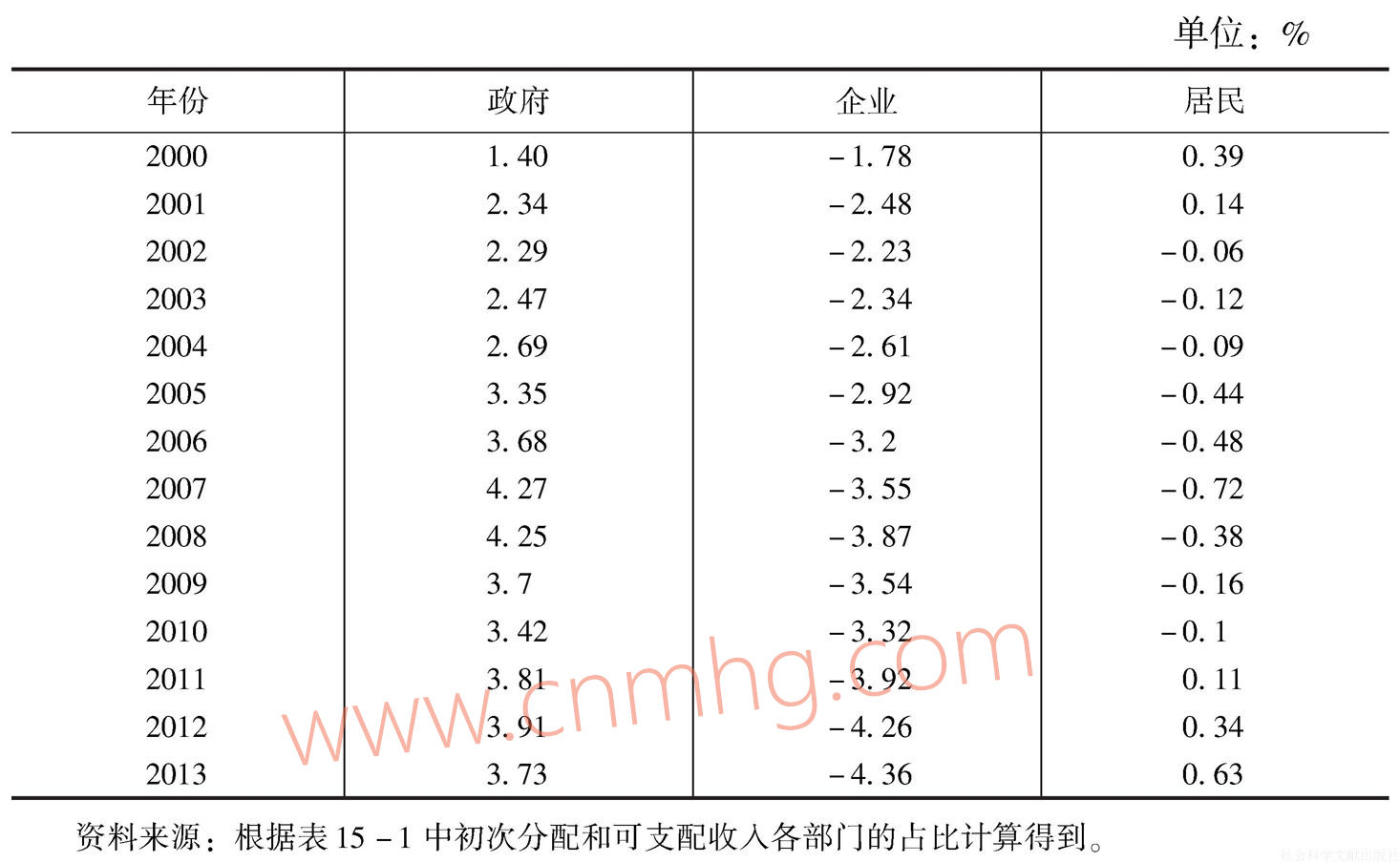 其次,我們對再分配之后的可支配收入的分配格局進(jìn)行分析(見表15-1)。從政府部門占比來看,2000~2007年,在可支配收入中政府部門占比呈不斷提高態(tài)勢,從14.53%上升至19.01%,提高了約4.5個(gè)百分點(diǎn)。2008年和2009年出現(xiàn)了一定的下降,但此后仍表現(xiàn)為上升趨勢,2012年達(dá)到了2000年以來的最大值,高達(dá)19.54%。2013年與2012年相比下降了0.6個(gè)百分點(diǎn)。從企業(yè)部門來看,2000~2008年在可支配收入中企業(yè)部門的占比總體上呈現(xiàn)上升趨勢,僅在2005年和2006年出現(xiàn)了小幅下降。2009~2012年企業(yè)部門占比則為下降態(tài)勢,從2008年的22.74%下降至2012年的18.47%。2013年企業(yè)部門占比比2012年提高了1.3個(gè)百分點(diǎn)。從居民部門來看,居民部門與政府部門、企業(yè)部門的變化趨勢呈現(xiàn)互補(bǔ)形式。2000~2008年,在政府部門和企業(yè)部門占比都上升的情況下,居民部門占可支配收入的比重持續(xù)下降,從2000年的67.54%下降至2008年的58.28%。2009~2012年,盡管政府部門的比重仍在提高,但是由于企業(yè)部門占比下降,居民部門占比出現(xiàn)上升態(tài)勢,2012年達(dá)到這一階段的最大值61.99%。2013年盡管政府部門占比出現(xiàn)了下降,但是企業(yè)部門占比的較大幅度的提高,居民部門占比再次出現(xiàn)下降。