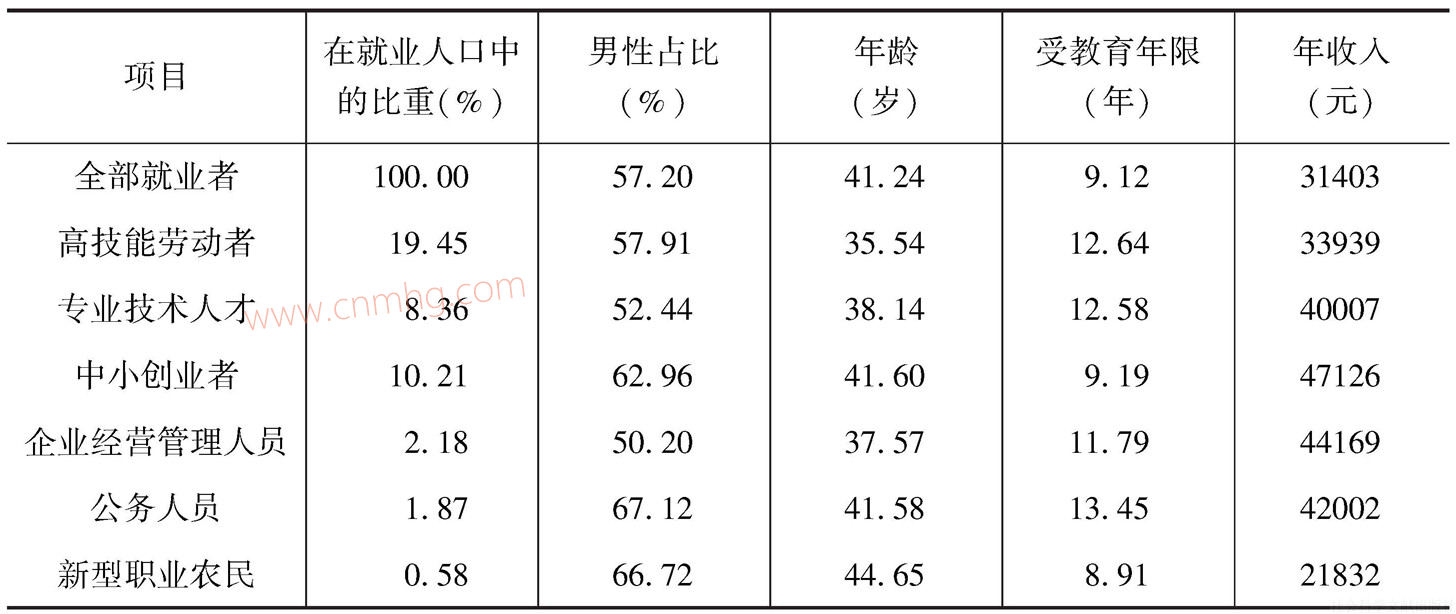 各群體的特征也存在一定差異。從性別來看,各群體均是以男性為主。企業(yè)經(jīng)營管理人員的男性比重最低,基本達(dá)到了男女性別比例平衡,而男性在公務(wù)人員以及新型職業(yè)農(nóng)民中所占的比重達(dá)到了2/3左右。從年齡來看,高技能勞動(dòng)者、專業(yè)技術(shù)人才和企業(yè)經(jīng)營管理人員的平均年齡低于全部就業(yè)者的平均水平,中小創(chuàng)業(yè)者、公務(wù)人員和新型職業(yè)農(nóng)民的年齡則高于平均水平。其中高技能勞動(dòng)者的年齡最低,為35.54歲,新型職業(yè)農(nóng)民的年齡最高,達(dá)到44.65歲。從受教育年限來看,高技能勞動(dòng)者、專業(yè)技術(shù)人才、企業(yè)經(jīng)營管理人員和公務(wù)人員的受教育年限均超過了全部就業(yè)者的平均水平,其中公務(wù)人員的受教育年限最高,達(dá)到13.45年;新型職業(yè)農(nóng)民的受教育年限為8.91年,低于平均受教育年限(9.12年)。中小創(chuàng)業(yè)者的受教育年限和全部就業(yè)者的平均受教育年限相差無幾。從年收入來看,僅有新型職業(yè)農(nóng)民的年收入低于全部就業(yè)者的平均水平,其他群體的收入均高于全部就業(yè)者的平均水平。年收入最高的是中小創(chuàng)業(yè)者,其后的順序分別是企業(yè)經(jīng)營管理人員、公務(wù)人員、專業(yè)技術(shù)人才和高技能勞動(dòng)者(見表15-4)。