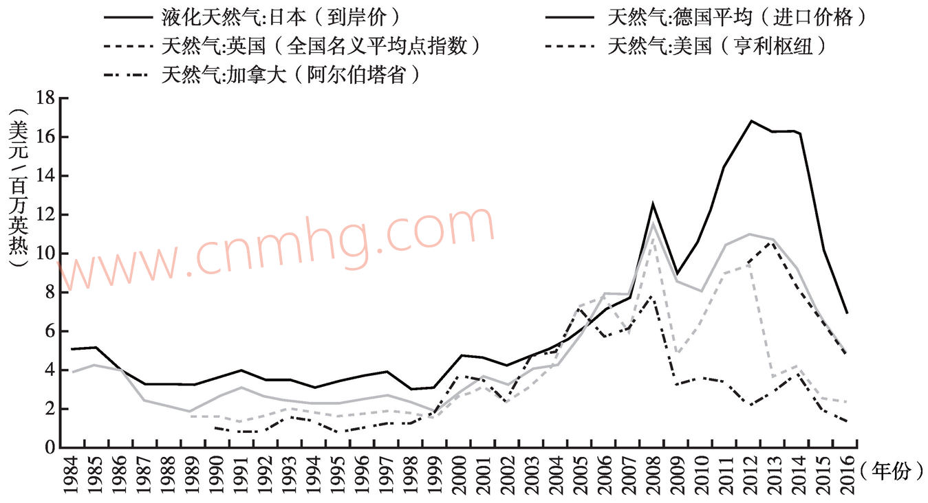 縱觀1984年至2016年的世界主要天然氣價格走勢(見圖4-1)可以較為明顯地發(fā)現(xiàn),第一,以日本為代表的亞洲市場的天然氣價格遠(yuǎn)高于同期美國、歐洲市場的價格。2016年,日本LNG進(jìn)口價格為6.94美元/百萬英熱單位,而同期美國亨利樞紐(Henry Hub)價格僅為2.46美元/百萬英熱單位,英國NBP天然氣價格為4.69美元/百萬英熱單位,日本價格相比于美國、英國分別高出約182%、48%,溢價程度之高令人咋舌。筆者發(fā)現(xiàn),1984年至2016年,日本LNG到岸價格較德國進(jìn)口價格高出了約33%,較英國NBP天然氣價格高出了約55%,較美國Henry Hub價格高出了約89%。