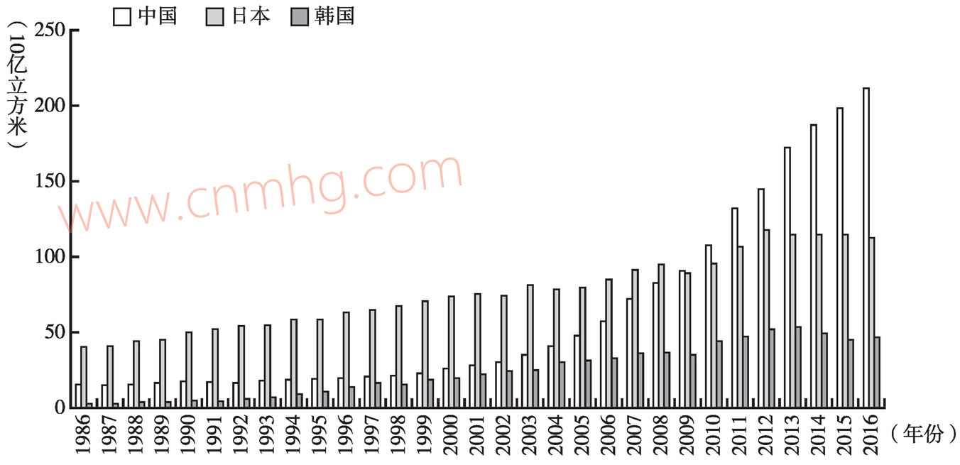 圖4-2 中國、日本、韓國天然氣消費(fèi)量