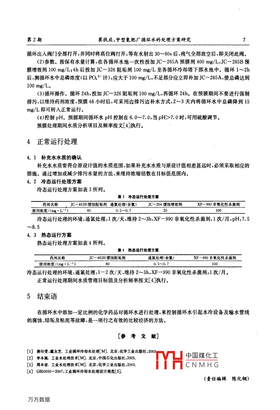 第11卷第2期安徽水利水電職業(yè)技術(shù)學(xué)院學(xué)報(bào)Vol 11 No. 220116 A JOURNAL OF ANHUI TECHNICAL COLLEGE OF WATER RESOURCES AND HYDROELECTRIC POWER Jun 2011中型氮肥廠循環(huán)水的處理方案硏究崔執(zhí)應(yīng)(安徽水利水電職業(yè)技術(shù)學(xué)院,安徽合肥231603)摘要:文章分析了化學(xué)清洗、預(yù)膜處理及正常運(yùn)行時(shí)的處理方案指出了操作要點(diǎn)。關(guān)鍵詞:循環(huán)水;化學(xué)清洗預(yù)膜處理;正常運(yùn)行DOI:10.3969/isn1671-6221.2011.02.002中圖分類號(hào):TQ441文獻(xiàn)標(biāo)識(shí)碼:A文章編號(hào):1671-622l(2011)02000503Ways to deal with circulating water in medium nitrogenous fertilizer plantsCUI Zhi-ying(Anhui Technical College of Water Resources and Hydroelectric Power, Hefei 231603, China)Abstract: This paper analyses chemical cleaning, prefilming treatment and programmes of solution innormal operation, and indicates the key points of operation.Key words: circulating water; chemical cleaning; prefilming treatment; normal operation0引言中型氮肥廠循環(huán)水在循環(huán)系統(tǒng)中不斷循環(huán)使用,會(huì)產(chǎn)生嚴(yán)重的沉積物的附著、設(shè)備腐蝕和微生物的大量滋生以及由此形成的粘泥污垢堵塞管道等問題,它們會(huì)威脅和破壞工廠長(zhǎng)周期地安全運(yùn)行,甚至造成經(jīng)濟(jì)損失。因此為了確保合成氨、尿素系統(tǒng)的正常運(yùn)行,必須選擇一種經(jīng)濟(jì)實(shí)用的循環(huán)水處理方案。1水沖洗保持循環(huán)水系統(tǒng)輸水管線及水冷器的清潔,是冷卻水化學(xué)清洗的必需條件之一’它能給預(yù)膜及正常運(yùn)行創(chuàng)造一個(gè)良好的環(huán)境。(1)水沖洗方法。主要是冷卻塔內(nèi)水槽及下水池用人工方法進(jìn)行清掃(2)水沖洗要求。主要是冷卻塔集水池水泵吸水池、管徑大于或等于800mm的新管,應(yīng)進(jìn)行人工清掃;管道內(nèi)清洗水流速不應(yīng)低于1.5m/s;清洗水應(yīng)從換熱設(shè)備的旁路通過。中國(guó)煤化工收稿日期:2010-11-28;修回日期:2010-1208作者簡(jiǎn)介:崔執(zhí)應(yīng)(1966-),男安徽桐城人,副教授從事化學(xué)與化工專業(yè)CNMHG安徽水利水電職業(yè)技術(shù)學(xué)院學(xué)報(bào)第11卷2化學(xué)清洗化學(xué)清洗是用化學(xué)方法使金屬設(shè)備的表面恢復(fù)清潔狀態(tài)的技術(shù)?;瘜W(xué)清洗技術(shù)的關(guān)鍵是選用適宜的專用化學(xué)品,通過化學(xué)清洗將水冷器內(nèi)部及水冷器進(jìn)出口管道內(nèi)的污物油脂等附著物,用化學(xué)方法清除干凈。2.1化學(xué)清洗處理方案化學(xué)處理方案如表1所列。表1化學(xué)清洗處理方案藥劑名稱C-164清洗劑JC-161清洗劑JC863消泡劑控制要求合成系統(tǒng)使用濃度/(mg·L-1)500~100050尿獻(xiàn)系統(tǒng)使用濃度/m·L")500~1000t:8~16h2.2化學(xué)清洗操作要點(diǎn)(1)狀態(tài)。為水沖洗而搭起的臨時(shí)連通管線應(yīng)拆除,以恢復(fù)原來狀態(tài)。確認(rèn)除排污閥及補(bǔ)充水閥之外的送水管線和回水管線同水冷器之間的所有閥門全部打開。(2)水速。在系統(tǒng)壓力允許范圍內(nèi),盡可能加速循環(huán),使水流速不低于1.5m/s(3)循環(huán)操作。循環(huán)Ih后,按保有水量計(jì),向冷卻塔下部水池內(nèi)投藥。在水池二側(cè)同時(shí)投加JC164100~200mg/L,循環(huán)8~12h,有大量泡沫產(chǎn)生時(shí),投加消泡劑。每隔1~2h測(cè)定循環(huán)水濁度一次,若濁度>20mg/L時(shí)應(yīng)進(jìn)行大排大補(bǔ),至濁度<15mg/L時(shí)方能進(jìn)行下一步處理。當(dāng)循環(huán)水濁度達(dá)到15mg/L以下時(shí),按水池保有水量計(jì),一次性投入JC-161清洗劑500mg/L,1h后開始測(cè)定pH,以后每1~2h分析pH、濁度1次。繼續(xù)投加JC-161清洗劑,使循環(huán)水pH維持在3.5~4.5,保持4~6h直至循環(huán)水濁度、總鐵穩(wěn)定后,開始進(jìn)行循環(huán)水大排污和大補(bǔ)水,只要補(bǔ)充水量允許,盡可能開大排污和補(bǔ)充水閥門,待循環(huán)水濁度<15mg/L,pH上升到60~70時(shí),即可停止排污及補(bǔ)水,迅速進(jìn)行預(yù)膜處理。(4)控制時(shí)間。當(dāng)清洗結(jié)束之后轉(zhuǎn)入預(yù)膜階段,預(yù)膜期間盡快加水置換干凈避免時(shí)間過長(zhǎng)引起二次腐蝕。清洗期間水質(zhì)分析項(xiàng)目及頻率按文[4]執(zhí)行。3預(yù)膜處理循環(huán)水系統(tǒng)用加大藥劑用量的方法,使在活化金屬表面迅速形成一層完整的薄而致密的保護(hù)膜,這處理稱預(yù)膜。預(yù)膜處理的好壞對(duì)整個(gè)水處理效果關(guān)系密切。3.1預(yù)膜處理的前提條件工業(yè)水中鈣離子濃度(以CaCO3計(jì))大于50mg/L,濁度小于10mg/L,總鐵<1mg/L;有一個(gè)清潔活化的金屬表面;水中有足夠的溶解氧;保證預(yù)膜劑的有效濃度。3.2預(yù)膜處理方案預(yù)膜處理方案如表2所列。2預(yù)膜處理方案藥劑名稱JC-265A預(yù)膜劑JC-265B預(yù)膜增效劑JC-326阻垢分散劑使用濃度/(mg·L-1)100~200預(yù)膜處理的環(huán)境:常溫時(shí)間48h,pH:6.0-2.0V山中國(guó)煤化工3.3預(yù)膜處理操作要點(diǎn)CNMHG(1)要求。確定涼水池的液面是否正常補(bǔ)水閥及排污四是雪夫可,明認(rèn)循壞水度<15mg/L,總鐵<1mg/L,確認(rèn)循環(huán)水pH是否在6.0~7.0范圍內(nèi),方可進(jìn)行予膜處理。要求各工段所有水冷器的第2期崔執(zhí)應(yīng):中型氳肥廠循環(huán)水的處理方案研