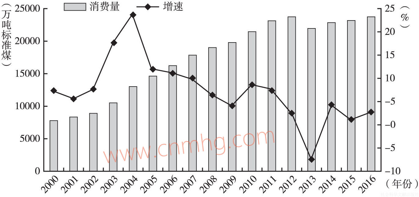 圖2 2000~2016年河南省能源消費總量及增長情況
