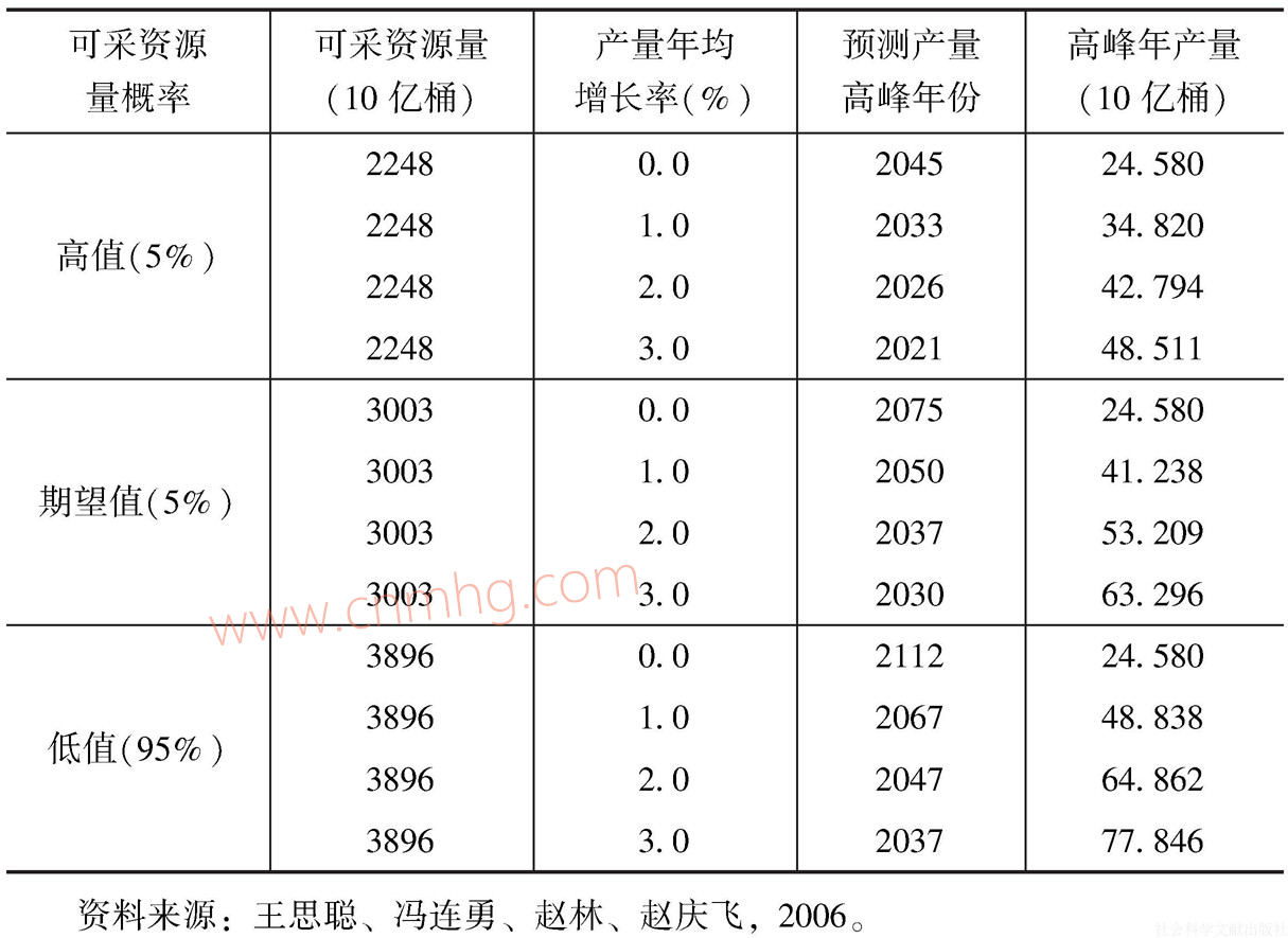 關(guān)于全球石油峰值,不同機(jī)構(gòu)得出的測算結(jié)果相差很大。國際能源署(EIA)按照石油儲(chǔ)量和產(chǎn)量年均增長率的不同預(yù)期,分別給出了12種不同情形下石油峰值產(chǎn)量和到來時(shí)間的估計(jì)結(jié)果(見表4.1)。在最悲觀的情形下,世界石油峰值將于2021年到來,峰值產(chǎn)量約為485億桶;在最樂觀的情形下,石油峰值則要到2112年才會(huì)到來。中國石油大學(xué)、中石油和中石化的四位研究人員2006年根據(jù)廣義翁氏模型的預(yù)測結(jié)果研究并指出,世界石油的峰值產(chǎn)量將在2020年前后出現(xiàn),峰值產(chǎn)量為每年40.3億噸[7]。不過,根據(jù)英國石油(BP)的統(tǒng)計(jì)數(shù)據(jù),2015年全球石油產(chǎn)量也已經(jīng)超過了這一預(yù)測值,達(dá)到了43.6億噸,大約相當(dāng)于335億桶。