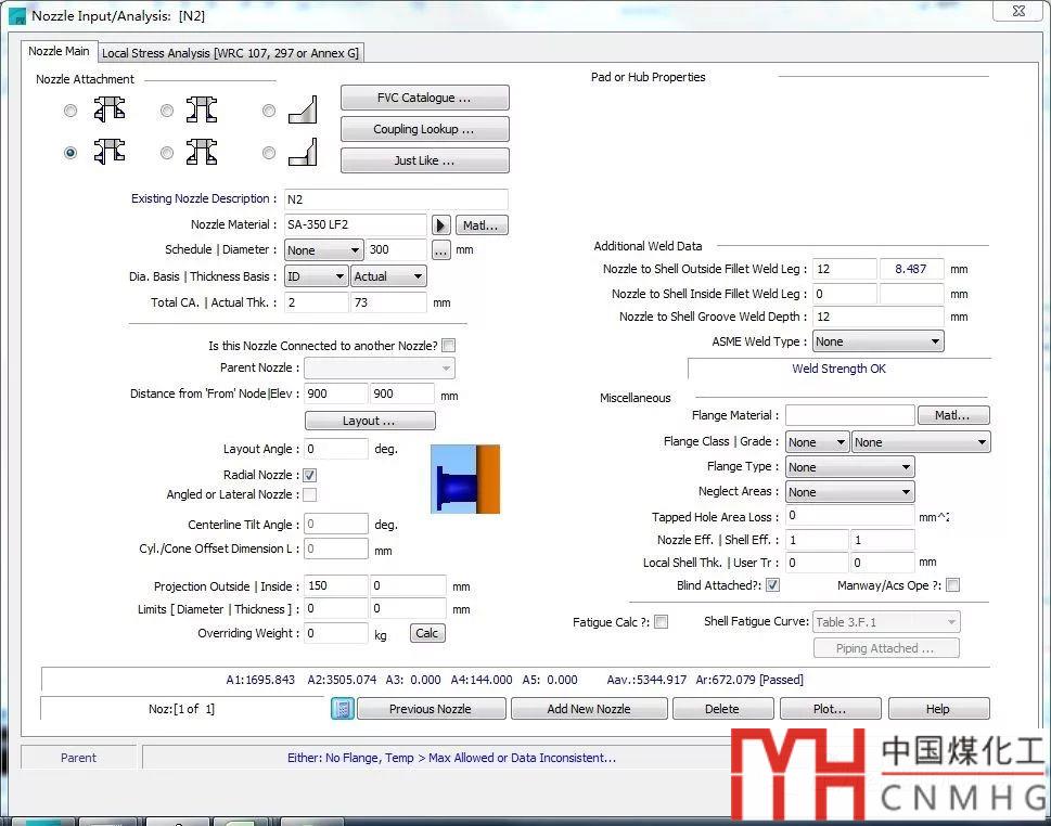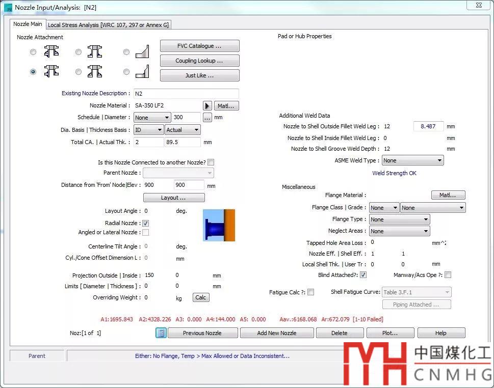 夾套內(nèi)壓需要厚度才7點幾,取的12mm。筒體富裕量很大嘛。所以繼續(xù)進行開孔補強計算。內(nèi)徑300,壁厚89.5試試,WTF,紅色警告,不通過?