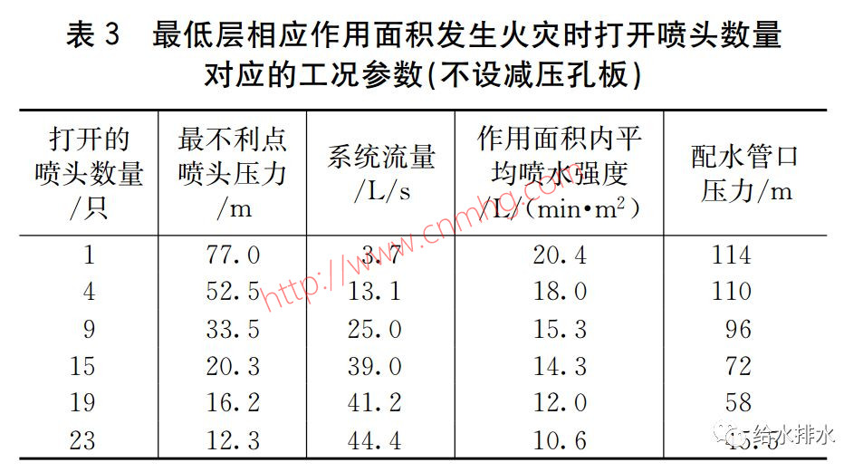 第2種情況:前期火災迅速蔓延至作用面積附近,并在作用面積附近基本保持不變,比如火災在前20 min快速蔓延至160 ㎡,后40 min或更長時間既沒有進一步蔓延也沒有被有效控滅,這種情況一般為特例,更大的可能是可燃物范圍只有160 ㎡,或火災被有效分割控制在該作用面積內(nèi)。此時對一定的自動噴水滅火系統(tǒng)用水總量,由于高強度噴水可以達到更好的滅火效果,適當?shù)脑黾訃娝畯姸龋ò辞八?,一般最大約增加1.3倍,實例中為39 L/s,配水管口壓力為72 m),對火災控滅并不會有不好的作用,設置減壓孔板,人為控制系統(tǒng)流量,使流量更接近設計流量(實例中為30 L/s),對火災控滅看不出有何作用。另外在設計火災延續(xù)時間內(nèi)(如1 h的后部分時間),由于大部分工程中消火栓用水與自動噴水滅火系統(tǒng)用水為合用水池,只要自動噴水滅火系統(tǒng)有效,將適量的消火栓用水通過自動噴水滅火系統(tǒng)投入到火災面積內(nèi),也不會對火災控滅起不好的作用,本實例中最底層相應作用面積在設計火災延續(xù)時間內(nèi)影響的消火栓用水量為(20×60×19.5+39×60×40)/1 000-108≈9(m³)(前20 min平均流量以19.5 L/s計,后40 min流量以39 L/s計);另根據(jù)計算,在與建筑最高層最不利作用面積高差為30 m樓層的相應作用面積內(nèi),沒有設減壓孔板時,火災蔓延到設計作用面積時的系統(tǒng)流量約為35 L/s,配水管口壓力為66.5 m,設計火災延續(xù)時間內(nèi)影響的消火栓用水量為(17.5×60×20+35×60×40)/1 000-108≈-3(m³),說明此時設計火災延續(xù)時間沒有影響消火栓用水量(前20 min平均流量以17.5 L/s計,后40 min流量以35 L/s計)。根據(jù)上述計算,說明在該情景下,沒有設置減壓孔板時,影響的消火栓用水量在有限的范圍內(nèi)。