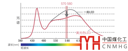 該產(chǎn)品采用特殊芯片,通過光譜控制技術(shù),調(diào)整光譜中570nm~580nm的波長分布,提高光譜中決定美麗程度的三個(gè)重要指標(biāo),如圖1所示。