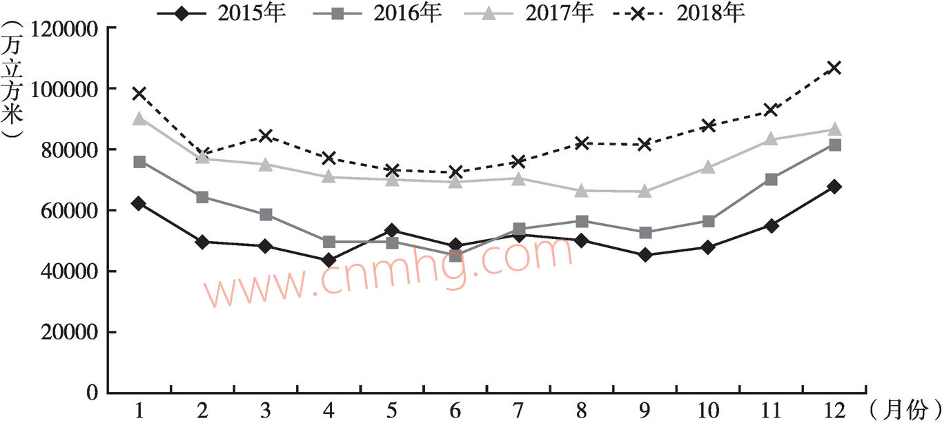 圖7 2015~2018年河南省分月度天然氣消費情況