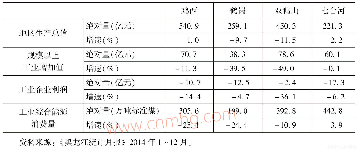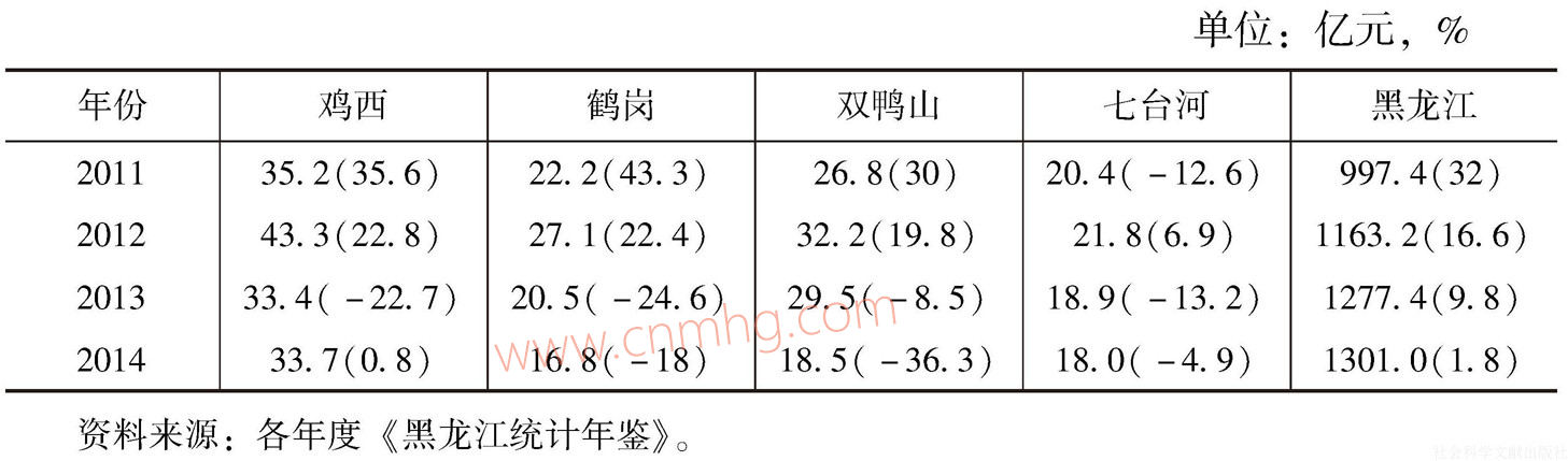 2014年,黑龍江省煤炭城市經(jīng)濟(jì)發(fā)展陷入空前困境,經(jīng)濟(jì)增長(zhǎng)下滑嚴(yán)重。地區(qū)生產(chǎn)總值方面,雞西市2014年實(shí)現(xiàn)地區(qū)生產(chǎn)總值540.9億元,較上年增長(zhǎng)1.0%;鶴崗市為259.1億元,較上年下降9.7%;雙鴨山市為450.3億元,較上年下降11.5%;七臺(tái)河市為221.3億元,較上年增長(zhǎng)2.2%。四煤城中經(jīng)濟(jì)增速最快的七臺(tái)河市比全省水平低了3.4個(gè)百分點(diǎn),比全國(guó)水平低了5.2個(gè)百分點(diǎn),而經(jīng)濟(jì)下滑最嚴(yán)重的雙鴨山市經(jīng)濟(jì)增速全省墊底。