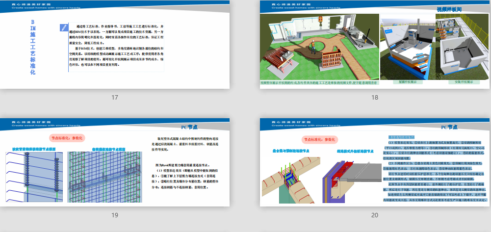 附件大?。?2.65MB所屬分類:BIM資料分享會員:芳華分享時間:2021-09-11最后更新:資源簡介/截圖:1 項目管理標準化2 項目BIM應用標準化3 BIM精益化應用舉例4 BIM試點應用與展望項目管理標準化是指把項目管理的成功做法和經(jīng)驗,通 過在相同或相似管理模塊內進行管理復制。 使項目管理實現(xiàn)從粗放式到制度化、規(guī)范化、標準化的 方式轉變。 其實質是總結項目管理中的成功做法和經(jīng)驗,將復雜的 問題程序化,模糊的問題具體化,分散的問題集成化, 成功的做法復制化,搭建起項目管理的資源共享平臺, 不斷創(chuàng)新項目管理方法,提升企業(yè)管理水平,為實施大 規(guī)模建設任務、確保工程質量提供保障。通過建章立制,使BIM應用各項工作清晰、有章可循、責任 明確、獎罰分明,包括集團統(tǒng)一的BIM應用制度和各區(qū)域公司的 BIM應用細則,形成較為完備的BIM制度體系。 集團層面根據(jù)國家標準和企業(yè)自身發(fā)展需要,建立涉及BIM 建模、項目流程、信息互用、族庫管理等基本BIM制度,明確集 團范圍內基本的、共性的BIM應用標準。構建結構清晰高效的組織機構,明確集團公司、區(qū)域公司、 項目部的部門和崗位設置、工作規(guī)范和標準。規(guī)范各部門和崗位 的管理標準,建立中天特色的“人、證、崗、能”統(tǒng)一體系。 區(qū)域公司加大公司和項目部BIM人員取證力度;同時,針對 當前各BIM崗位人員工作實際,全面梳理和細化BIM人員標準化 的動作和做法,編制崗位培訓教材,要求相關教材采用視頻、 PPT等形式,并在集團信息化平臺形成共享。通過合理的配置BIM資源,使BIM資源有效發(fā)揮作用,確保項目 BIM應用正常運行,提升競爭力和效益。 BIM資源主要包括軟件資源、硬件資源和族庫資源: BIM時代,靠一款軟件解決所有問題并不現(xiàn)實,需要合理評估各軟 件的優(yōu)缺點,結合企業(yè)自身項目特點,將BIM軟件配置標準化; 硬件資源能決定對大型或復雜項目的支持深度,應當綜合考慮項目 大小、復雜程度、BIM應用目標、團隊應用程度、工作方式等,區(qū)分不 同的工作內容,配備不同的硬件,形成BIM硬件的階梯型標準化配置; 施工族庫資源同《項目標準化參考標準》相結合。通過將工藝標準、作業(yè)指導書、工法等施工工藝進行標準化,并 通過BIM技術予以表現(xiàn),一方面可以集成項目施工的技術資源,另一方 面將內容簡明化和直觀化,同時規(guī)范各操作崗位的工藝標準,保證工程 質量安全,降低工程成本。 基于BIM技術,創(chuàng)建三維模型,多角度清晰地識別各部位的結構和 空間關系。以精細的模型或動畫展示施工工藝或工序;提供使用者各角 度觀察了解項目的便利;而可視化樣板間展示項目成果并節(jié)約成本、綠 色環(huán)保,也可以在不同項目重復利用。裝配整體式混凝土結構中預制構件的豎向連接 是通過后澆混凝土、灌漿料和座漿材料、鋼筋及連 接件等實現(xiàn)。xa0 圖為Revit所建剪力墻套筒灌漿連接節(jié)點。 (1)模型表達效果(即能從模型中提取到的信 息):①能了解上下層剪力墻連接方式(套筒連 接);②暗柱位置及墻體分布筋位置;鋼筋的整體 分布;連接鋼筋與不連接鋼筋、套筒位置。疊合梁與柱連接節(jié)點 (1)模型表達效果:①梁在柱上的擱置方式及擱置高度;②梁的預制形狀 (平口或凹口,是否帶剪力槽等);③柱的預制形狀(柱頂有無高低口,空心還 是實心); ④梁和柱的伸出鋼筋形式(考慮鋼筋碰撞避讓); ⑤梁的箍筋形式; ⑥現(xiàn)澆區(qū)域鋼筋布置。 (2)不同部件區(qū)分:①疊合梁用土黃色材質填充;②預制柱用灰綠色填充; ③箍筋用紅色表示; ④柱縱筋用綠色表示;⑤梁伸出縱筋用藍色表示。 梁柱節(jié)點建模時應根據(jù)保護層厚度、各個方向伸出的鋼筋長度和規(guī)格確定出 筋位置及錨固形式,錨固長度夠則直錨,不夠則考慮彎錨或者機械錨固。 此例節(jié)點中有四層鋼筋需要避讓,最外側是柱子的保護層,往里是柱子的箍 筋,然后是柱子縱筋,再往里是左側梁的縱筋伸出,第四層是右側梁的縱筋伸出。 如連續(xù)梁左右兩側梁底有高差又能直錨的情況下可以考慮上下錯開,這樣平面 內鋼筋就變成三層,具體采用哪種方式還是需要考慮生產(chǎn)和施工的難易度來決定。